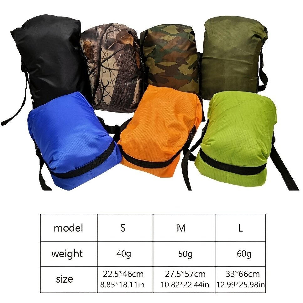 100% Brand New; High Quality!Material: NylonColor: Black; Camouflage; GreenSize: S; M; LSport Type: Hiking; camping; picnic; traveling; climbingFeatures: Compression; portable; dustproof; tear-resistantFunction:Storage packageQuantity: 1pcNote: Ultralight mesh stuff sack drawstring storage bag only; accessories not included.