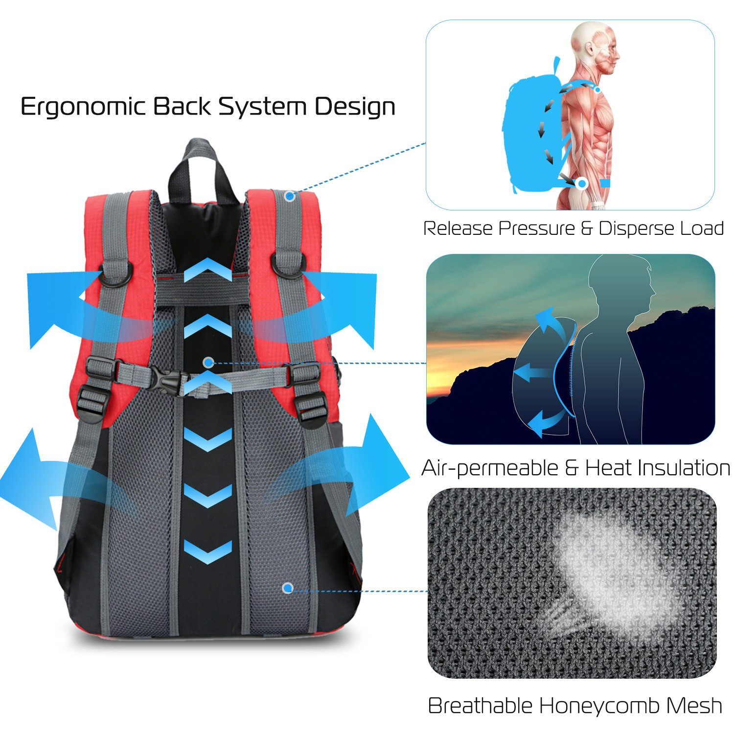 *Ergonomic Back and Shoulder Strap*:Designed from the combination of honeycomb mesh and sponge; which is in accordance with ergonomic suspension system. The outdoor backpack is breathable; air-permeable; load dispersion; heat insulation; shockproof; anti-slipping and moisture-proof.