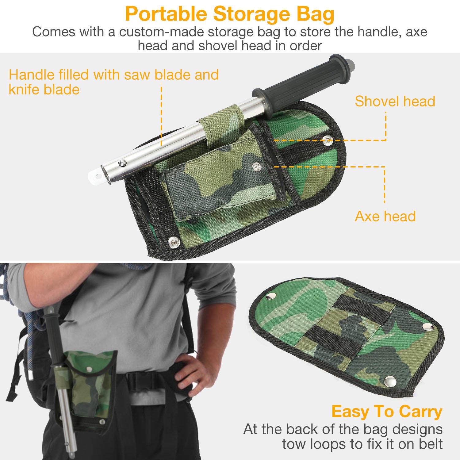 ** EASY TO STORE*:The saw blade and knife blade can be organized into the handle. And it comes with a custom-made storage bag to store the handle,axe head and shovel head in order. Besides,the storage bag can be fixed on your belt for an easy carry.