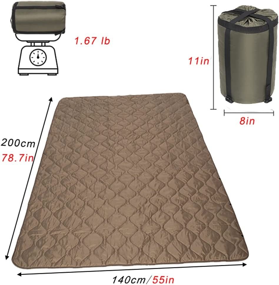 Material:210T Ripstop and filled with spray-bonded cotton WATERPROOF AND WARM BLANKET: The Woobie camo blanket is made of 210T Ripstop and filled with spray-bonded cotton; prevent water from immersion to poncho liner blanket and keep you warm and cozy; widely used in various harsh environments. One-sided with Camo Pattern; another-sided with Deep Khaki. MEASUREMENTS: This Military Emergency Poncho Liner opens up to approximately 140cm by 200cm; weighs 0.75kg and comes with matching compression sack; the bottom diameter of the compression sack is 18cm and the height is 30cm. The Blanket is packable and be fully compressed into its compression sack for easy carry and storage; reduces space and volume. MULTI-USE PONCHO LINER: Just Click the Three Premium Double Snaps can easily turn your blanket into a poncho; and keeps you hands free for chatting around the campfire; tailgating; or cozying up with your favorite book. Snaps straight into a poncho opposed to tying is a more secure attachment for sure. MULTIPURPOSE: The survival woobie blanket can be used as camping and outdoor blanket; beach mat; picnic mat; poncho; but alse a fun option at home for enjoying outdoor movie nights or fire-pits. This lightweight and compact camo blanket is great to make your camping; hiking; backpacking; picnicking; hunting; and fishing trips so much easier. PRACTICALITY: There is no more practical a piece of gear than the woobie/poncho liner! Warm but it breathes; lightweight and easy to pack; store; and wash. The waterproof army blankets can hand or machine wash; which make it are easier to maintenance.