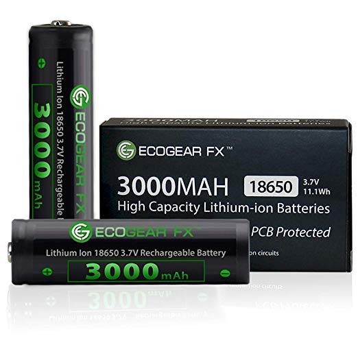 Best 18650 battery pcbHigh powered 18650 lithium flashlight batteries offering 3000mAh of reliable power. The EcoGear FX 18650 button top lithium-ion rechargeable batteries are unique and are packed with an amazingly amount of powerful energy. This is our best 18650 battery as it provides dramatically increased longevity, low self-discharge, efficiency and optimized usage time. The choice battery for LED tactical flashlights and battery-powered professional gear. When you think of batteries, what might come to mind  is what you have seen in most in the store aisles. There is the widely used AA or AAA alkaline size batteries. However, alkaline batteries are old out-dated technology and cannot match the power of lithium-ion batteries. These 18650 PCB lithium flashlight batteries deliver the power needed and offer up to 500 charging cycles. The 18650 button top battery is the best for using in LED flashlights, video doorbells, camping lanterns, indoor fans, portable radios, bluetooth speakers, work lights, motion lights, cordless power tools, solar yard lights and many other low drain devices. Lithium rechargeable batteries are also used in aerospace technologies applications (radio-controlled models, model aircraft, the Mars Curiosity rover, etc.). The 18650 PCB battery is protected with a small built-in electronic circuit which prevents overcharging and over-discharging. Features and Benefits: • Integrated PCB Protection • Lithium Ion 18650 cylindrical rechargeable batteries • Internal PCB protection prevents under-voltage at 2.5V and over-voltage at 4.25V • Higher energy density and lower weight than many other rechargeable 18650 lithium flashlight batteries Battery Specifications: • Capacity: Nominal&: 3000mAh, Minimum: 2600 mAh • Internal PCB protection prevents under-voltage at 2.5V and over-voltage at 4.25V • Nominal Voltage: Average 3.7V • Cut-off Voltage: 2.5V • Internal Impedance: less or equal to 180 milli-ohm (with PTC) • Cycle Performance: 90% of initial capacity at 400 cycles • Cycle life: > 500 cycles • Charge: Current = 0.5C (~1500mA) Voltage = 4.2 V End Current = 0.01 mA • Discharge: Current = 0.5C (~1500mA) End Voltage = 3.0V Product Dimensions • Diameter: 18.5 mm • Length: 68.7 mm These are the same lithium-ion batteries which were once top-selling on Amazon. Unfortunately, Amazon no longer allows the sale of many types of lithium-ion batteries including 18650 batteries. These batteries are NOT recommended for high-drain devices (i.e. Vaping Products).