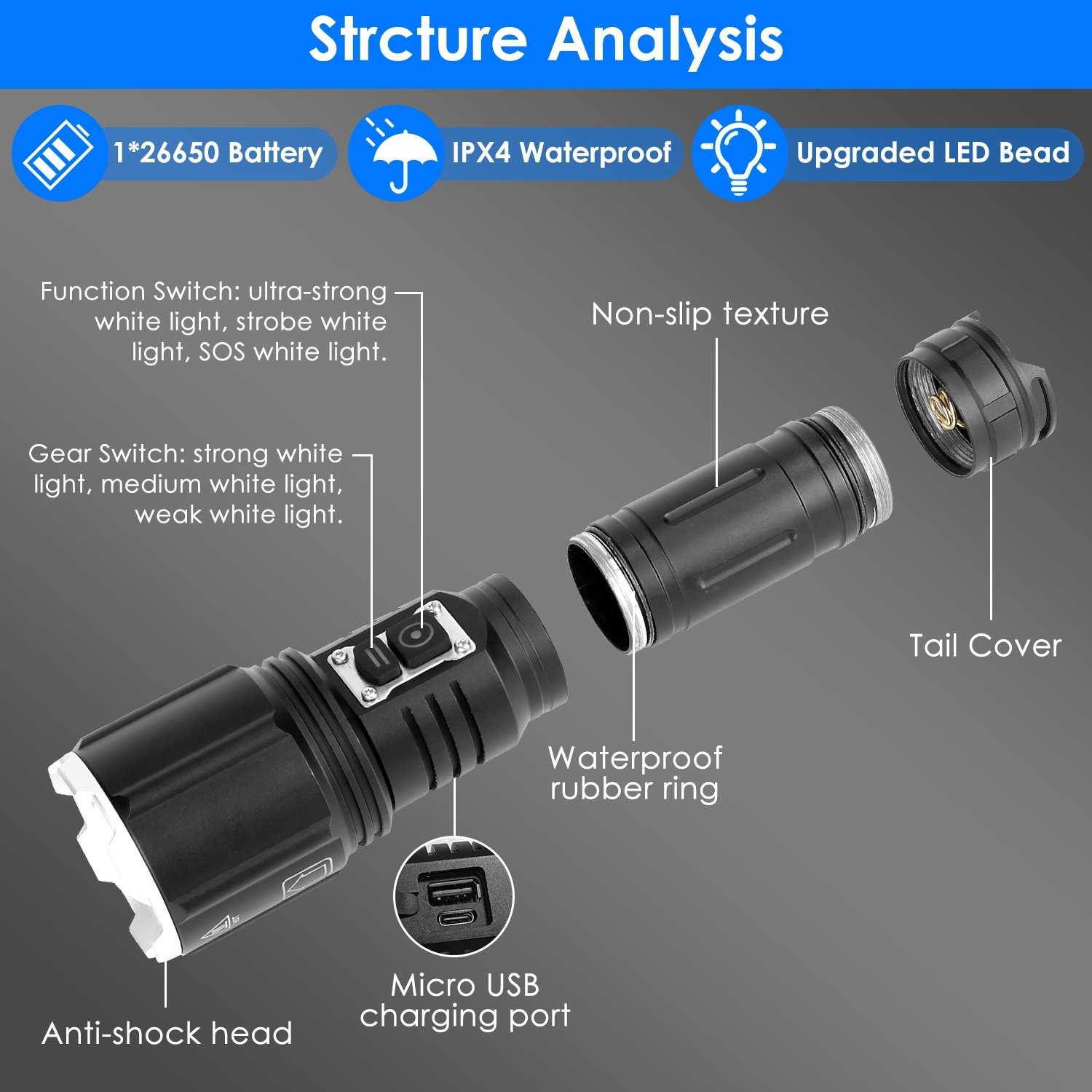 *Multifunctional Flashlight*:When our phone is dead or in low battery; we can use this multifunctional flashlight as an emergency power bank. When we are stalked; we can use it as a self-defense weapon because the ultra-strong or strobe white light can defend ourselves and SOS white light can use for seeking help. When we get stuck; we can utilize its diamond-shaped head structure as a window-breaking hammer to escape.