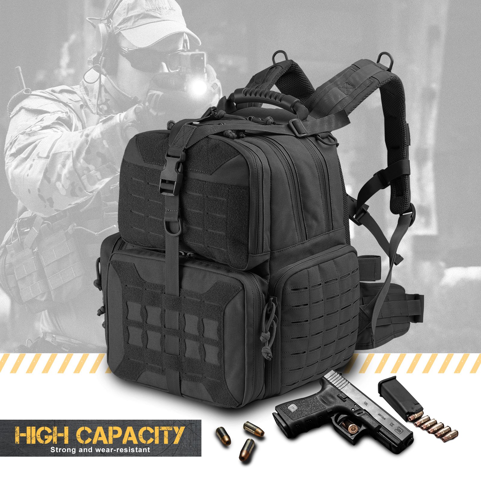 Multifunctional Professional Range Bag: VOTAGOO range backpack can hold 3 pistols of different size and magazines. Large capacity space can be used to carry all tactical accessories you need such as sabers; flashlights; shooting goggles; shooting earmuff; gloves; etc.Durable Design With 1000D Nylon: This Tactical range bag is made of 1000D polyester fabric; sturdy; water-resistant; durable; suitable for tactical range activity and outdoor shooting or hunting. Three removable pistol cases built-in sponges can protect guns and ammo more effective; avoid wear and tear.Comfortable & Portable: Professional breathable & ergonomic thicker padded design on the back make you sweat-proof and comfortable. Lockable compartment make your firearms more safe and avoid unnecessary troubles. Thoroughly design will fulfill your range day needs.Stylish & Upgrade Dimension: The Size of this range backpack is L14' x W10' x H17'. Built-in backpack rain cover can handle any weather without worrying about your backpack getting dirty. Customizable web can make your backpack more personalized.VOTAGOO After-sale Service: VOTAGOO has been committed to the R&D and production of tactical equipment. We offer 180-day warranty. Please contact us feel free; we are always here to help.