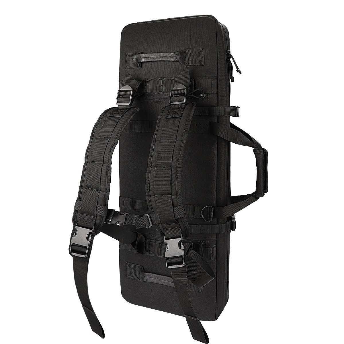 Durable Construction Material: Constructed by heavy-duty 600D nylon fabric exterior & interior. Padded on all side for increased protection. Removable protective pad keep your valuable firearm from wear also can be used as shooting mat.Safe & Spacious: Dual lockable zippers keep your firearms safe; 2 locks included in the package. Holds 2 rifles and 2 pistols; ample storage in the front for your range accessories. Molle compatible webbing for customization.Professional Rifle Bag: Rugged ballistic pack cloth construction; extra 2 outside accessory pouches fit all your need. Portable removable backpack w/storage pouches. Double stitching construction workmanship solid.Hold 2 RifleRefined Design & Functional: Double rifle case with more refined design; multiple compartments inside and out provide storage for just about anything you’ll want to carry. Fully customizable web and loop platform can carry all your other tactical accessories.